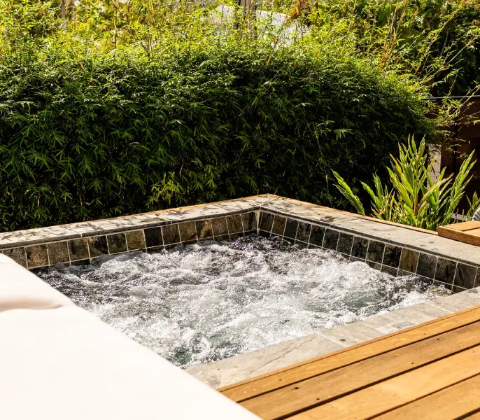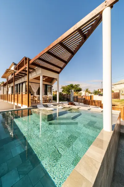Le refuge aquatique. Sœur jumelle de Villa Evaé, Villa Bernoa se distingue par sa <strong>petite piscine chauffée en pierre naturelle</strong>. Parfaite pour les amateurs de baignade qui recherchent calme et intimité dans un cadre tropical.