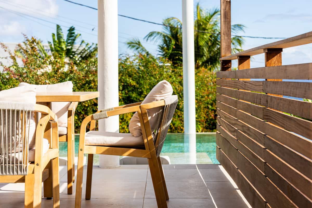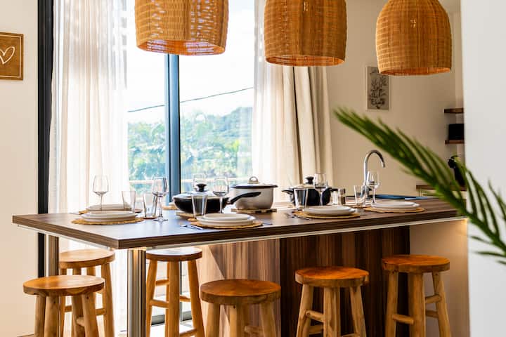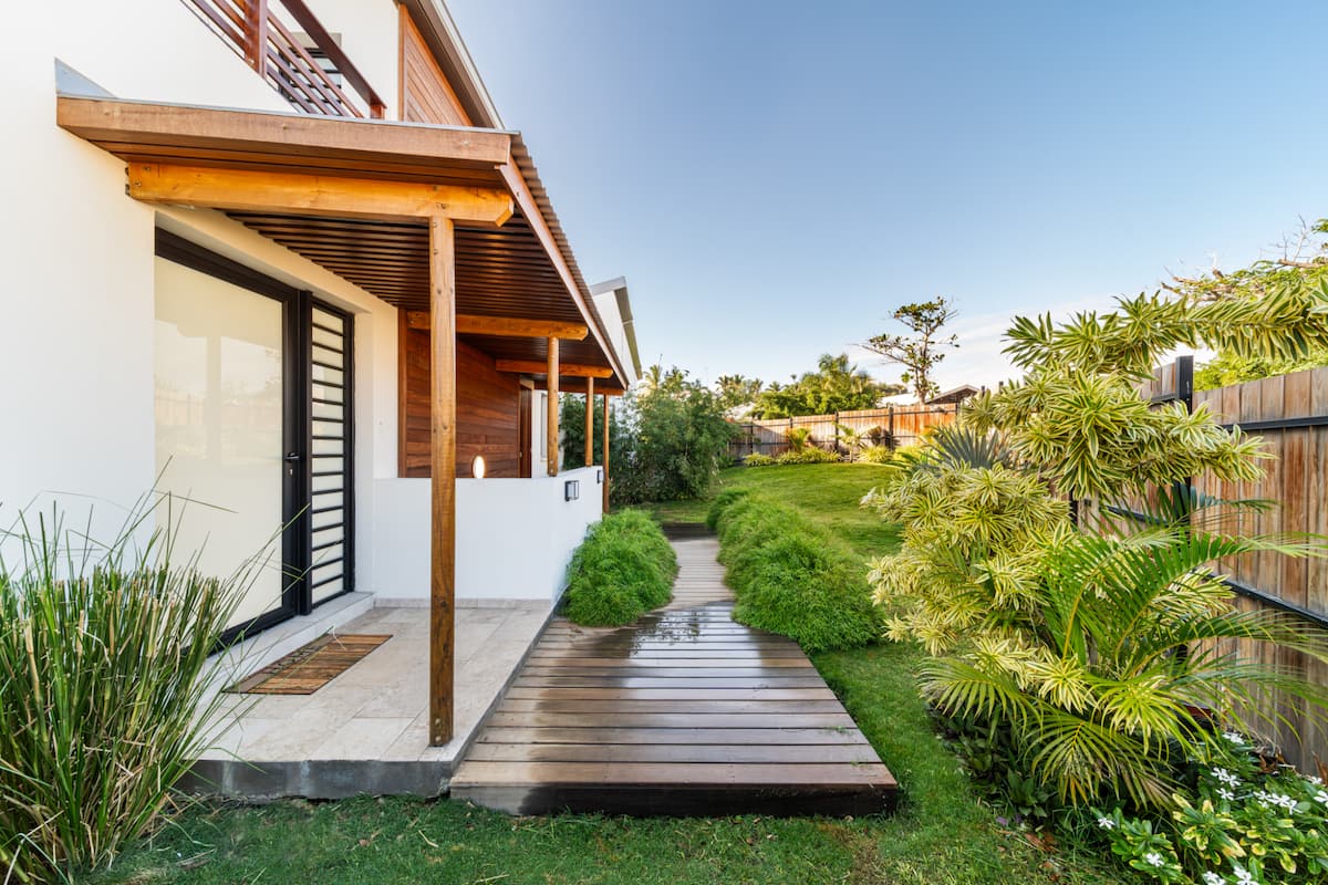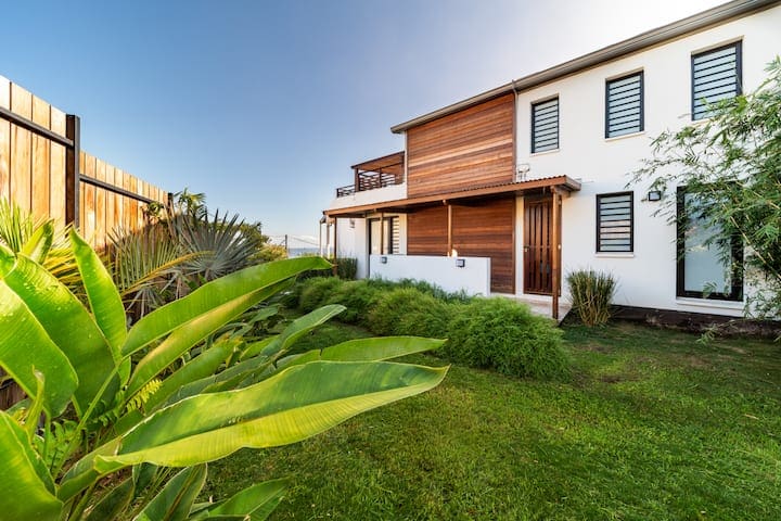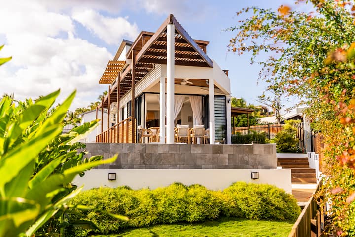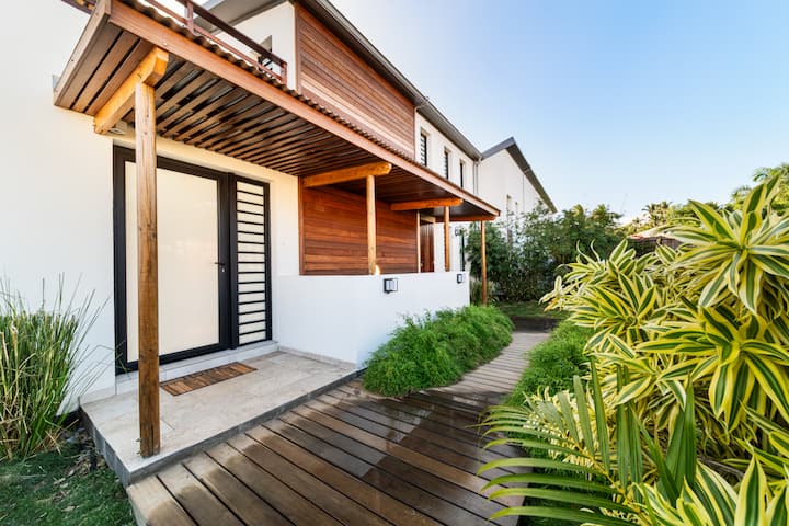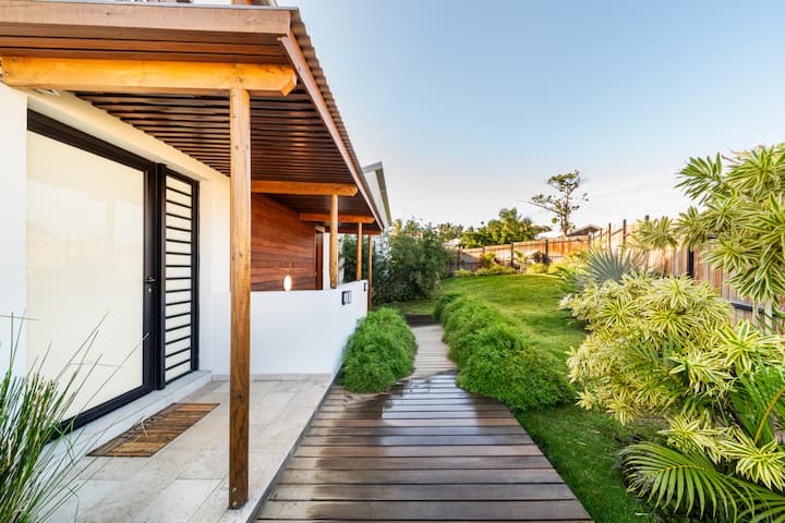 Autour de la villa, un jardin paysager dense et coloré crée une atmosphère unique. Palmiers, plantes exotiques, fleurs tropicales… Ici, chaque pas est une immersion sensorielle dans un petit paradis végétal.