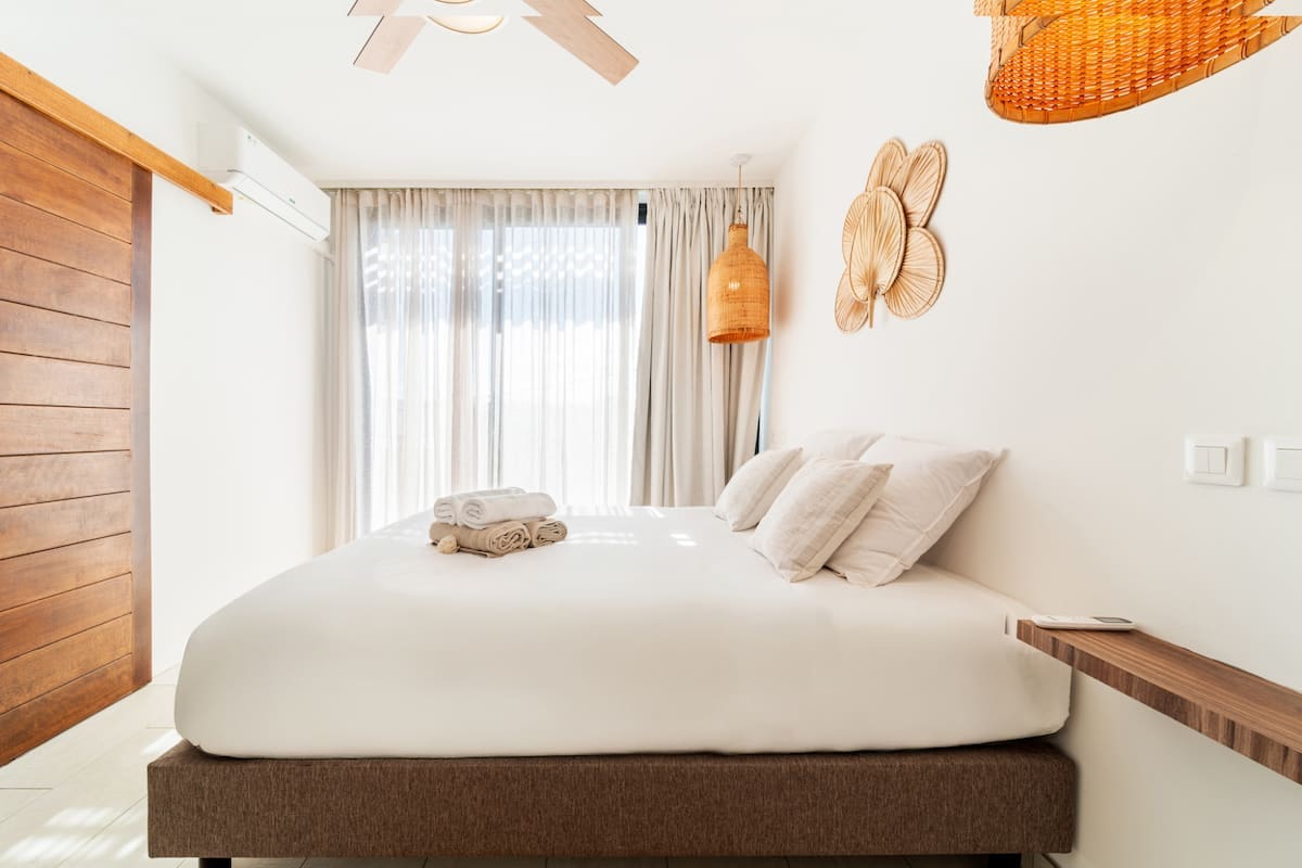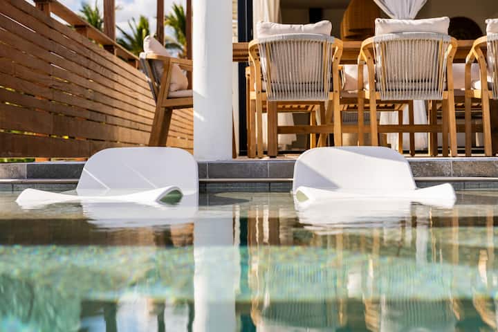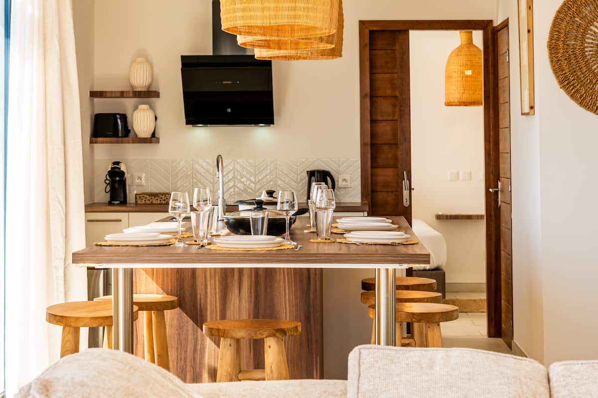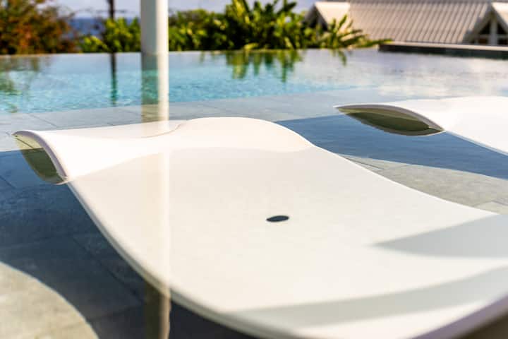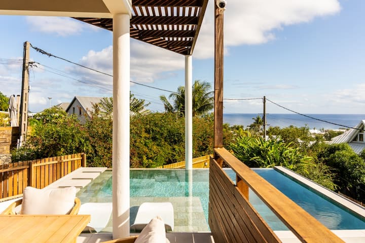 La pièce principale s’ouvre entièrement sur une vue imprenable : l’océan Indien à perte de vue. Depuis la piscine à débordement ou les transats, chaque instant devient un tableau vivant. Imaginez-vous siroter un cocktail au coucher du soleil, dans un calme absolu.