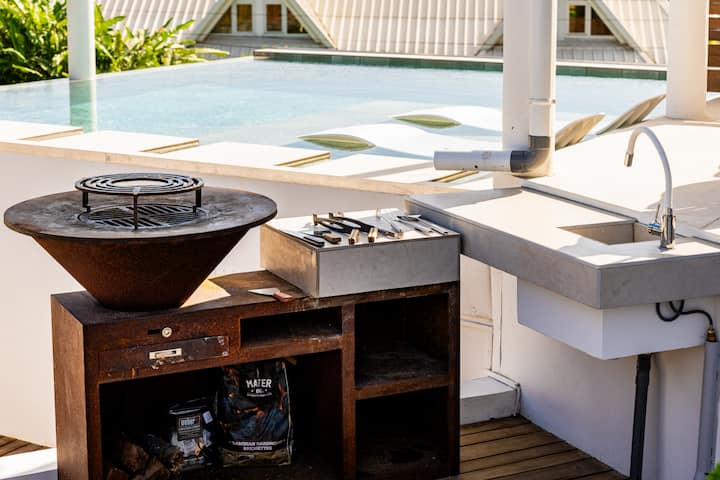 La cuisine est entièrement équipée pour préparer de vrais repas à partager. La cuisine extérieure est équipée d’un brasero en acier Corten. Sa grande table intérieure et extérieure accueille aussi bien les dîners en famille que les déjeuners ensoleillés face à la piscine.